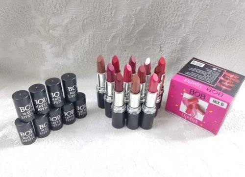 set of lipsticks in various shades. On the right side, there is a pink packaging box with the brand name “BOB” written on it. On the left, a few closed lipsticks are standing upright with “BO MATTE LIPSTICK” labeled on them. In the center, multiple open lipsticks are displayed in different shades, including pink, brown, red, and nude tones