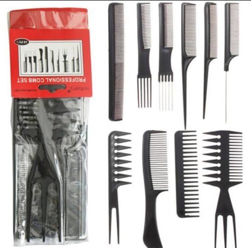 comb set containing multiple black plastic combs of different shapes and designs. Some combs have fine and wide teeth, while others have tail ends or forked handles for styling.