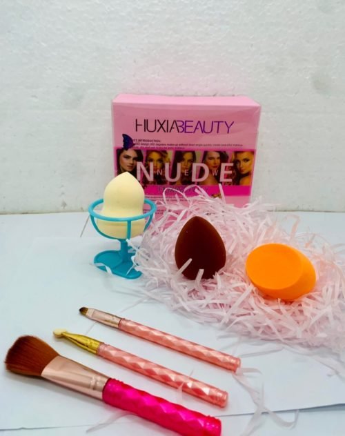 makeup set including three beauty sponges in different shapes and colors (white, brown, and orange), with one placed in a blue sponge holder. There are also three makeup brushes with pink and gold handles and soft bristles. In the background, there is a HUXIA BEAUTY “NUDE” makeup box, which appears to be an eyeshadow palette or cosmetic set. The arrangement includes decorative shredded paper, giving it a stylish and aesthetic presentation.