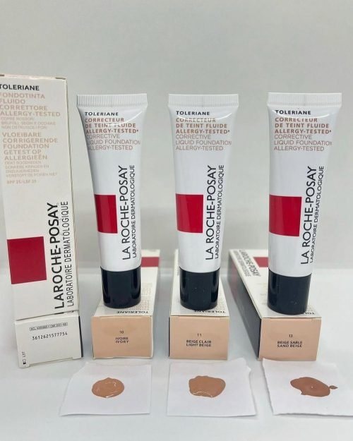 AL. The products shown are La Roche-Posay Toleriane Corrective Fluid Foundation in shades 10 Ivory, 11 Light Beige, and 13 Sand Beige. This foundation is designed for sensitive, intolerant, or allergic skin and provides high coverage to correct imperfections and even out the complexion. It contains a patented texturizing agent for a natural makeup result and long-lasting comfort. It also includes SPF 25 for UV protection.