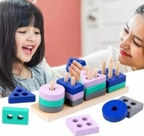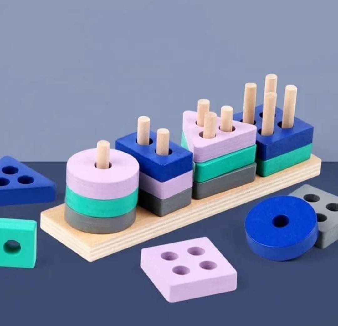 wooden shape-sorting and stacking toy. It consists of a wooden base with multiple vertical pegs and various geometric blocks in different shapes such as circles, squares, rectangles, and triangles. The blocks come in shades of blue, green, gray, and purple and have corresponding holes that allow them to be stacked onto the pegs.