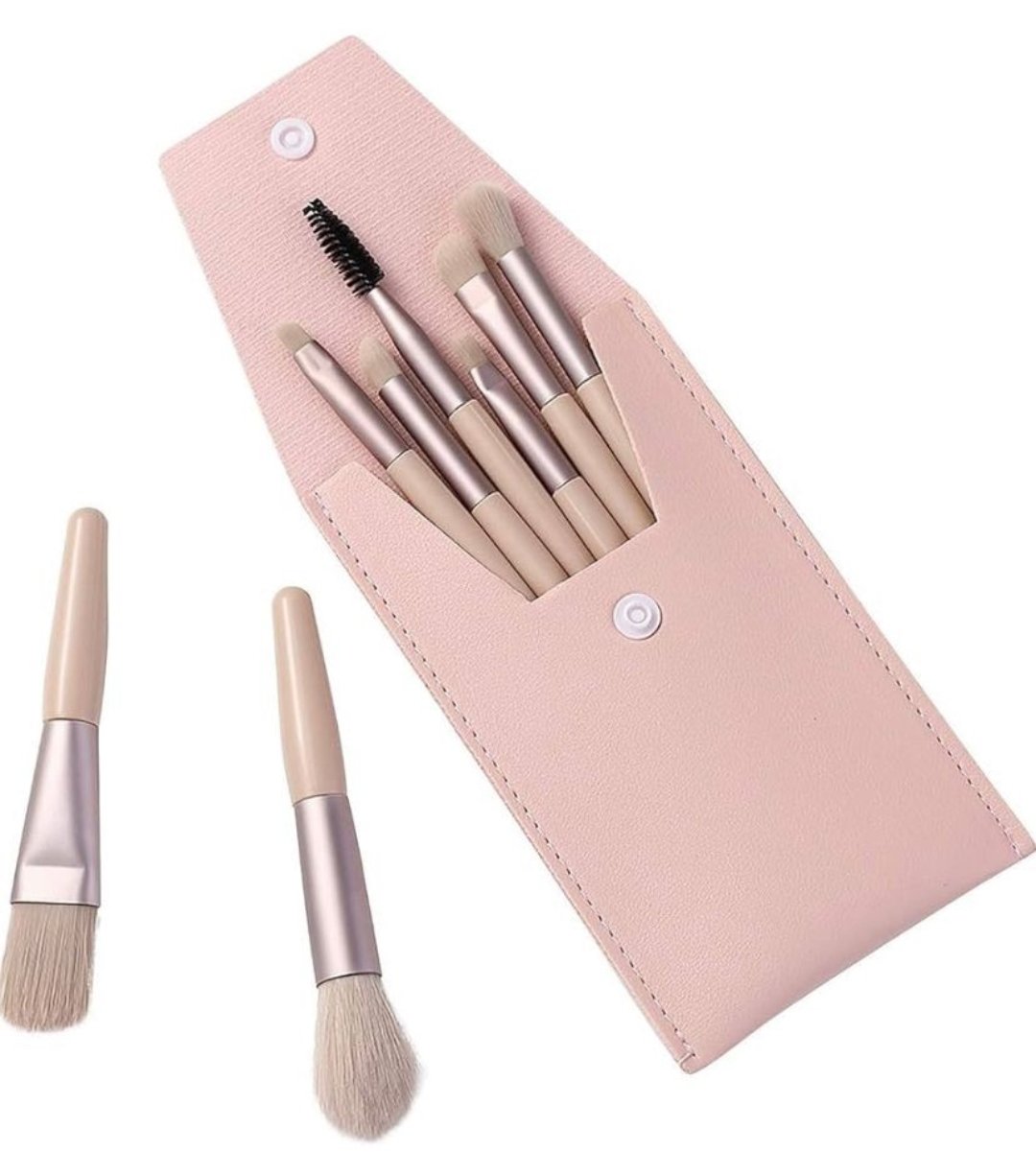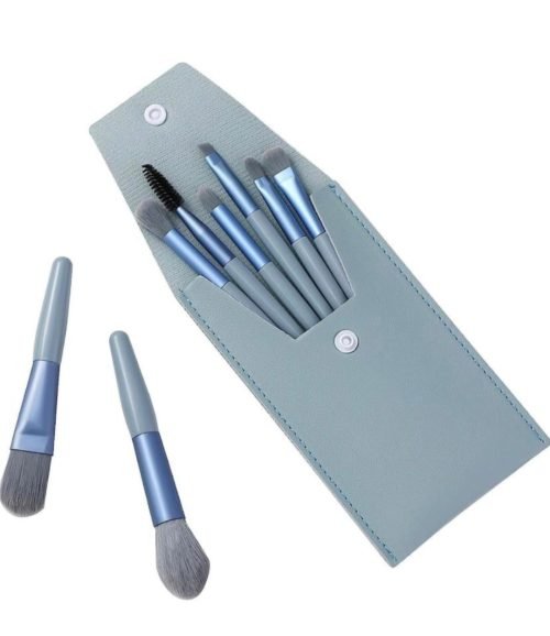 makeup brush set in a stylish blue pouch with a button closure. The set includes multiple brushes with soft gray bristles, metallic blue ferrules, and matching blue handles. Some brushes are designed for face makeup application, while others are for precise eye makeup detailing. The elegant and travel-friendly design makes it convenient for on-the-go use