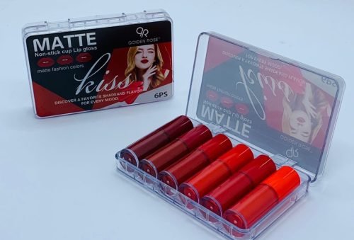 Golden Rose Kiss Matte Lip Gloss Set, featuring six rich and bold shades of red and orange tones in a sleek transparent case. The packaging highlights the matte, long-lasting formula, perfect for creating a flawless, non-sticky lip look. This set is ideal for those who love high-pigment, smooth application lip glosses with a luxurious finish.