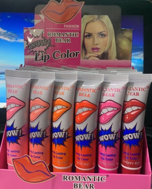 ROMANTIC BEAR WOW! Lip Color collection. These are long-lasting peel-off lip tints, known for their vibrant and bold shades. The packaging features a fun and playful design with lips and bright colors, emphasizing the WOW! effect of the product. The lip tints come in various shades like pink, orange, red, and cherry, providing a semi-permanent stain for a natural yet striking look