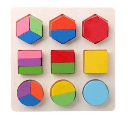This is a Wooden Fraction Puzzle Board designed for children to learn about shapes, colors, and basic fractions through hands-on play.
